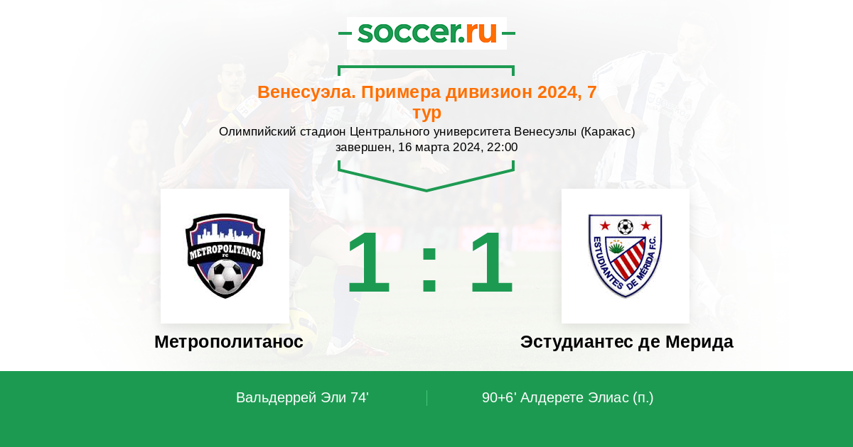 Венесуэла. Примера дивизион 11.04.2022 Эстудиантес Мерида Логотип футбольный клуб Эстудиантес Мерида 3:1 Логотип футбольный клуб Метрополитанос (Лос-Текес) Метрополитанос