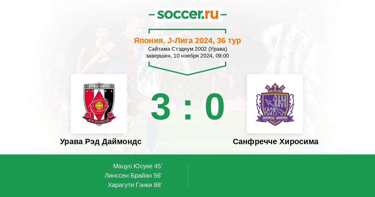 Япония. J-Лига 1 09.11.2025 Санфречче Хиросима Логотип футбольный клуб Санфречче Хиросима 3:0 Логотип футбольный клуб Урава Рэд Даймондс (Сайтама) Урава Рэд Даймондс