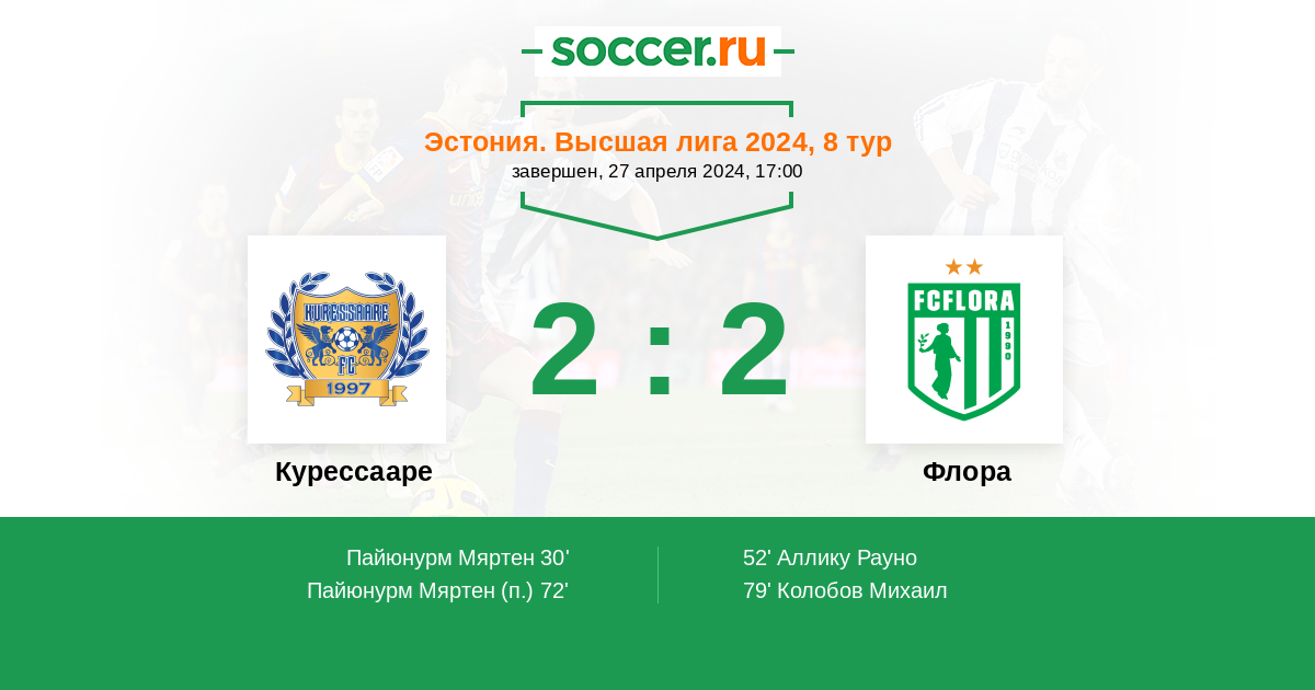 Эстония. Высшая лига 17.05.2022 Флора Логотип футбольный клуб Флора (Таллин) 4:0 Логотип футбольный клуб Курессааре Курессааре