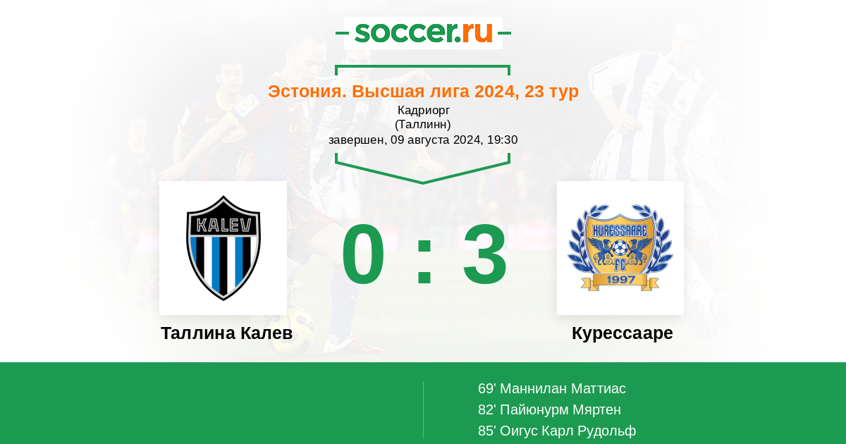 Эстония. Высшая лига 29.03.2024 Курессааре Логотип футбольный клуб Курессааре 3:0 Логотип футбольный клуб Таллина Калев Таллина Калев