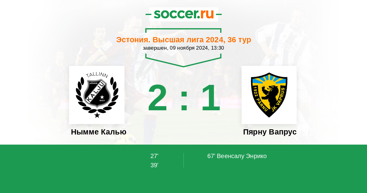 Эстония. Высшая лига 03.07.2024 Нымме Калью Логотип футбольный клуб Нымме Калью (Таллин) 4:2 Логотип футбольный клуб Пярну Вапрус Пярну Вапрус