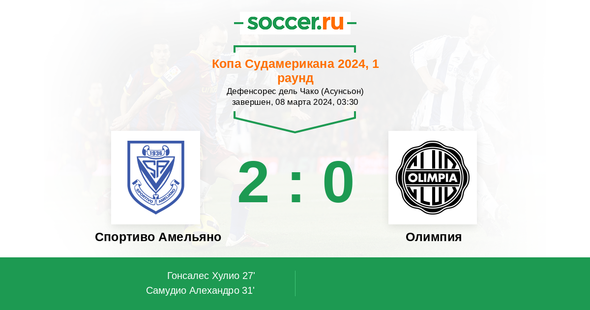 Парагвай. Примера дивизион 26.03.2023 Спортиво Амельяно Логотип футбольный клуб Спортиво Амельяно (Асунсьон) 2:2 Логотип футбольный клуб Олимпия (Асунсьон) Олимпия