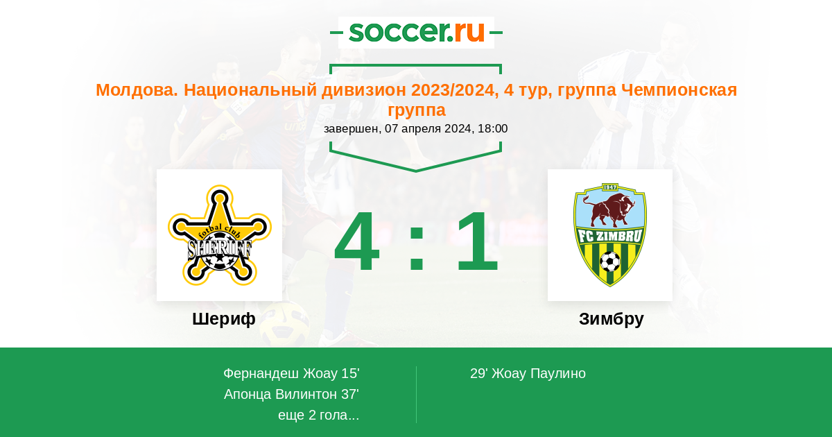 Молдова. Национальный дивизион 01.04.2023 Зимбру Логотип футбольный клуб Зимбру (Кишинев) 0:2 Логотип футбольный клуб Шериф (Тирасполь) Шериф