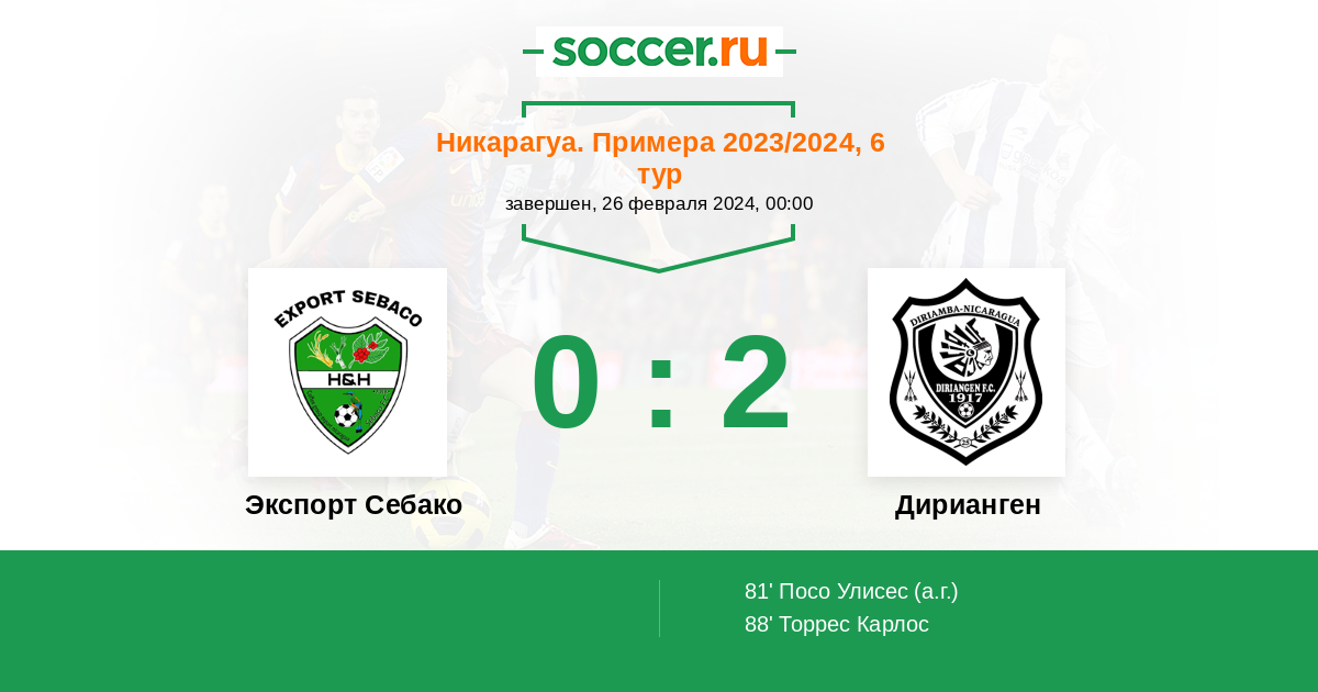 Никарагуа. Примера 27.02.2023 Экспорт Себако Логотип футбольный клуб Экспорт Себако 1:2 Логотип футбольный клуб Дирианген (Дириамба) Дирианген