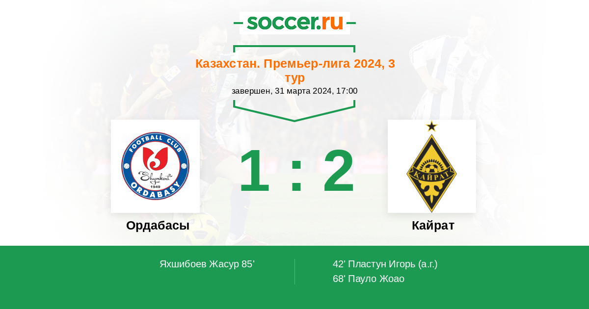 Казахстан. Премьер-лига 22.07.2018 Ордабасы Логотип футбольный клуб Ордабасы (Шымкент) 2:1 Логотип футбольный клуб Кайрат (Алматы) Кайрат