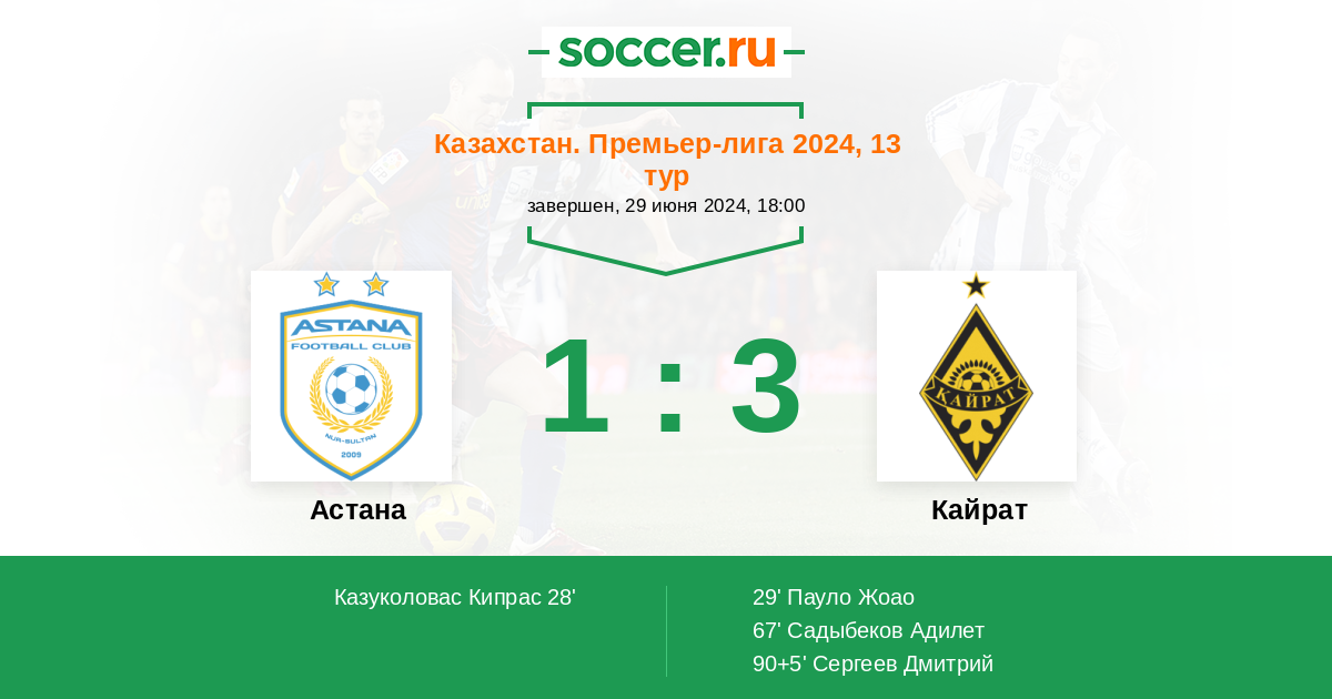 Казахстан. Премьер-лига 28.06.2015 Кайрат Логотип футбольный клуб Кайрат (Алматы) 2:0 Логотип футбольный клуб Астана Астана