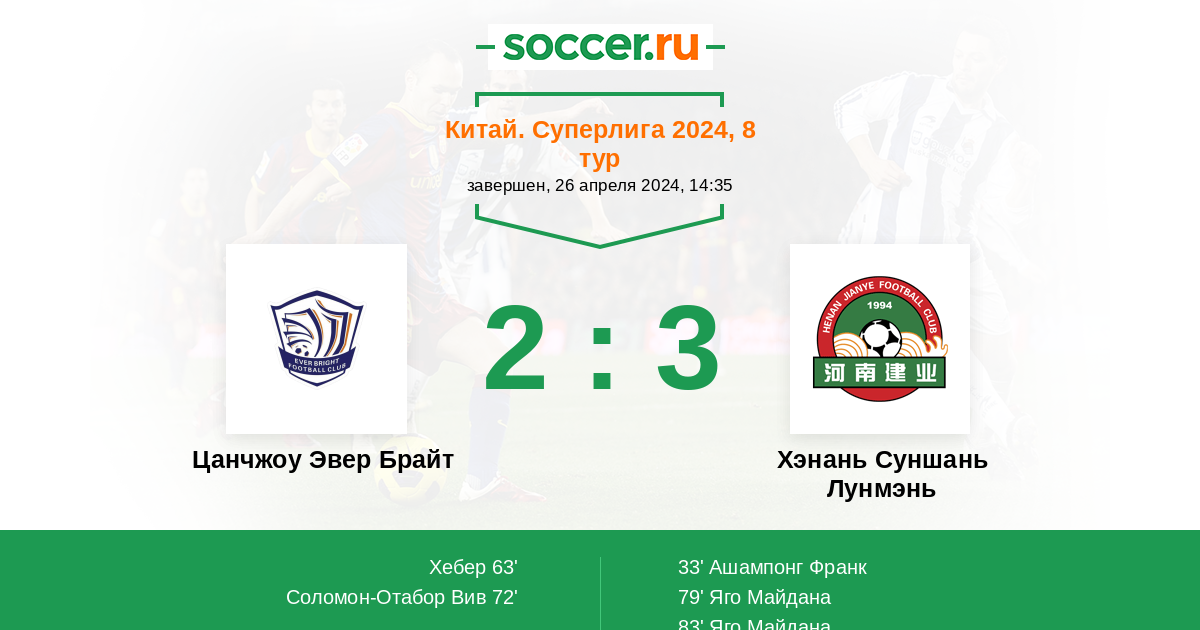 Китай. Суперлига 16.08.2024 Хэнань Суншань Лунмэнь Логотип футбольный клуб Хэнань Суншань Лунмэнь (Чжэнчжоу) 0:2 Логотип футбольный клуб Цанчжоу Эвер Брайт Цанчжоу Эвер Брайт