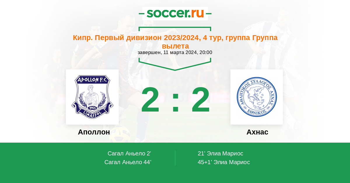 Кипр. Первый Дивизион 29.03.2008 Ахнас Логотип футбольный клуб Ахнас 1:1 Логотип футбольный клуб Аполлон (Лимассол) Аполлон