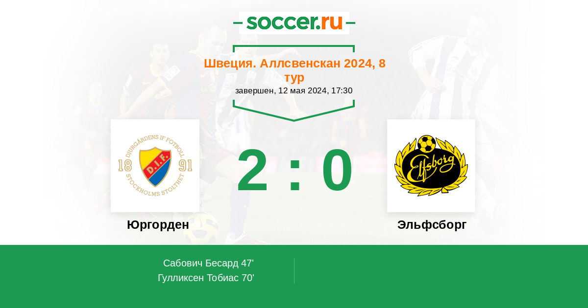 Швеция. Аллсвенскан 19.05.2019 Юргорден Логотип футбольный клуб Юргорден (Стокгольм) 2:0 Логотип футбольный клуб Эльфсборг (Бурос) Эльфсборг