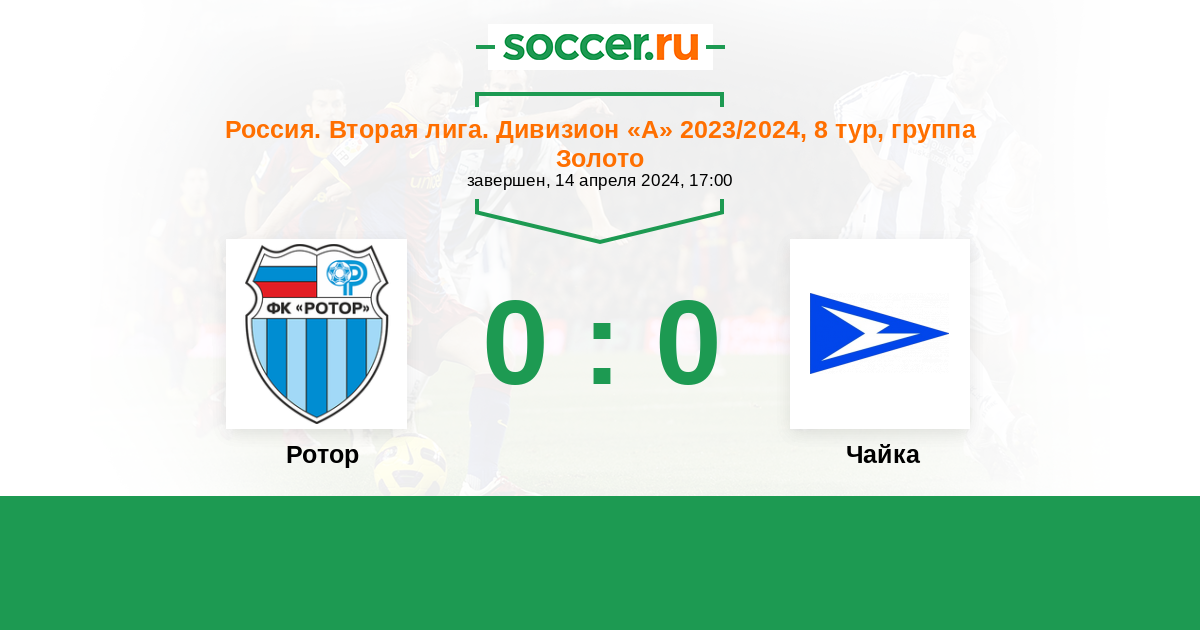 Россия. Вторая лига. Группа 1 15.04.2023 Чайка Логотип футбольный клуб Чайка (Песчанокопское) 0:0 Логотип футбольный клуб Ротор (Волгоград) Ротор
