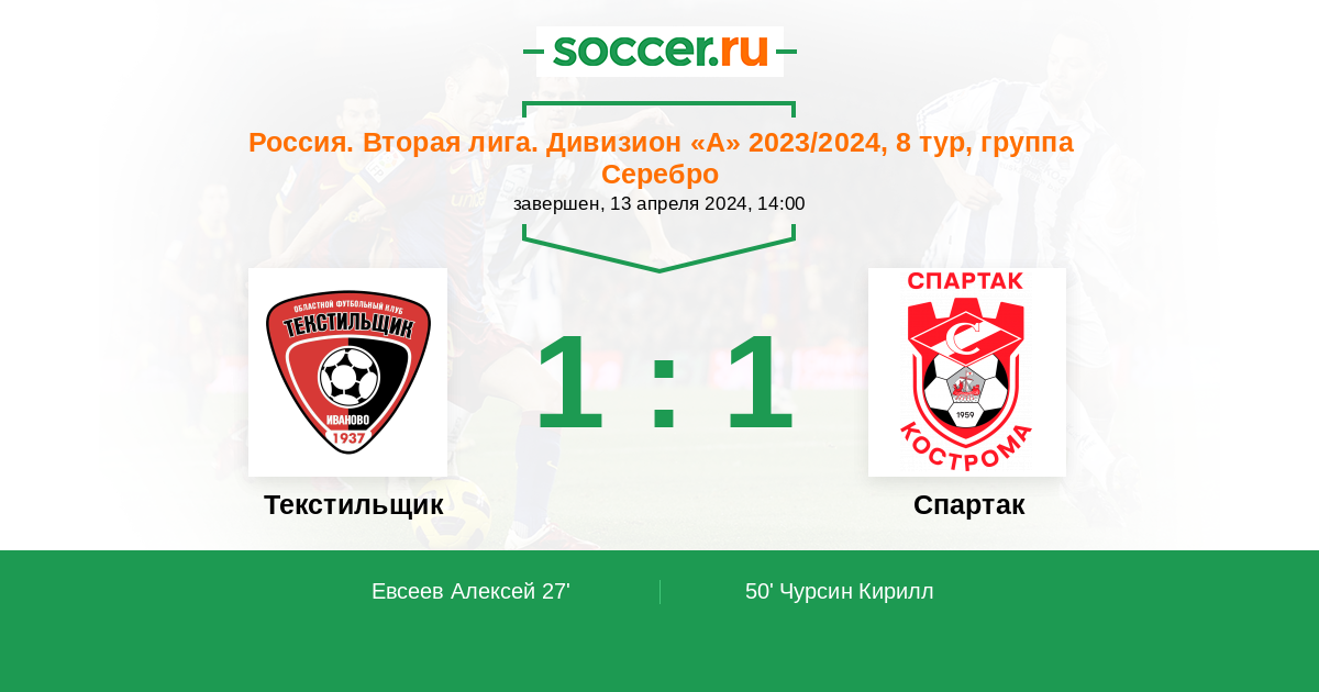 Россия. Вторая лига. Группа 2 04.11.2017 Текстильщик Логотип футбольный клуб Текстильщик (Иваново) 2:0 Логотип футбольный клуб Спартак Кострома Спартак Кострома