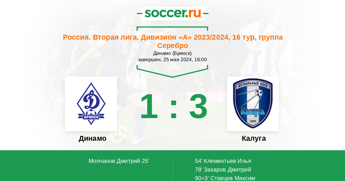 Россия. Вторая лига. Группа 3 23.05.2016 Калуга Логотип футбольный клуб Калуга 2:2 Логотип футбольный клуб Динамо Брянск Динамо Брянск