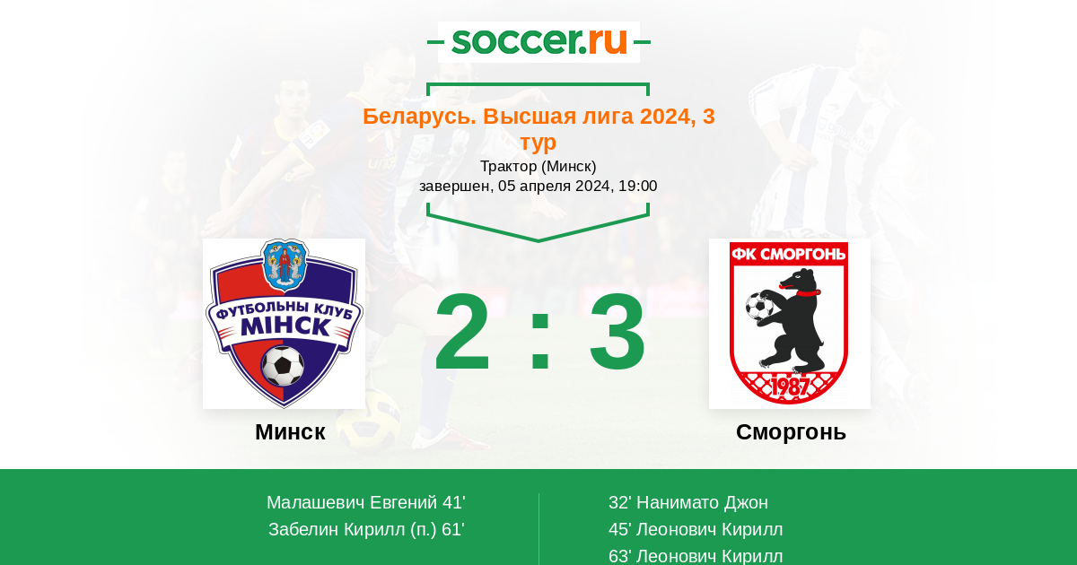 Беларусь. Высшая лига 10.06.2023 Минск Логотип футбольный клуб Минск 2:1 Логотип футбольный клуб Сморгонь Сморгонь