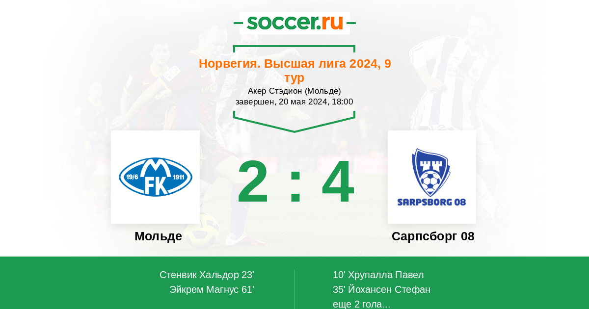 Норвегия. Высшая лига 22.07.2023 Мольде Логотип футбольный клуб Мольде 5:1 Логотип футбольный клуб Сарпсборг 08 Сарпсборг 08