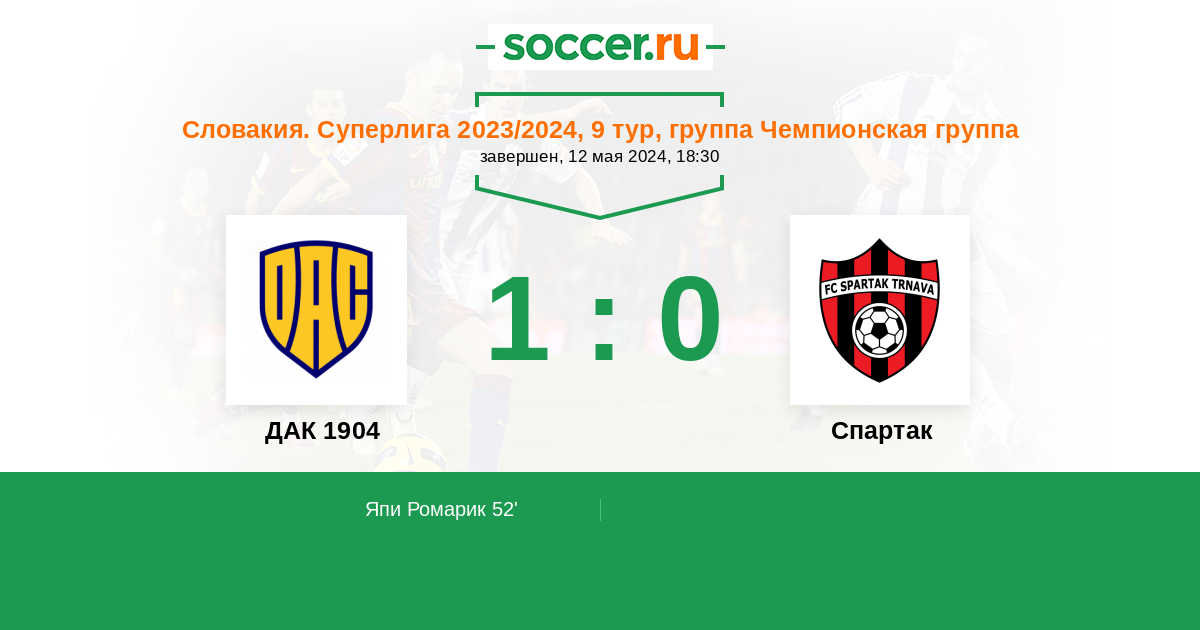 Словакия. Суперлига 23.04.2023 Спартак Логотип футбольный клуб Спартак (Трнава) 1:1 Логотип футбольный клуб ДАК 1904 (Дунайська Стреда) ДАК 1904