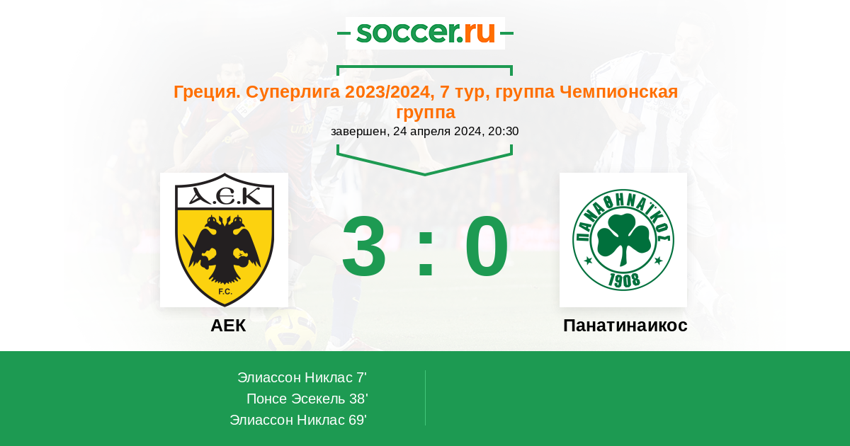 Греция. Суперлига 03.04.2024 Панатинаикос Логотип футбольный клуб Панатинаикос (Афины) 2:1 Логотип футбольный клуб АЕК (Афины) АЕК