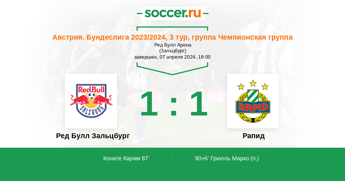 Австрия. Бундеслига 26.04.2023 Рапид Логотип футбольный клуб Рапид (Вена) 1:1 Логотип футбольный клуб Ред Булл Зальцбург Ред Булл Зальцбург