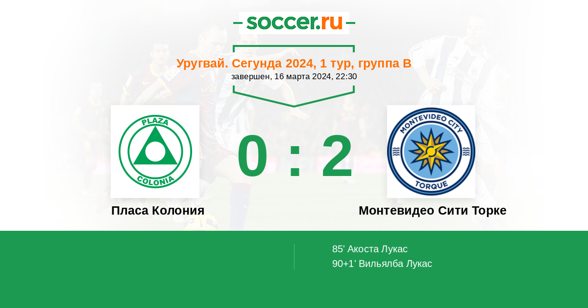 Уругвай. Примера A 30.03.2021 Монтевидео Сити Торке Логотип футбольный клуб Монтевидео Сити Торке 2:0 Логотип футбольный клуб Пласа Колония (Колония-дель-Сакраменто) Пласа Колония