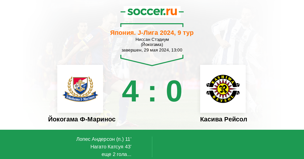 Япония. J-Лига 1 05.10.2024 Касива Рейсол Логотип футбольный клуб Касива Рейсол 1:0 Логотип футбольный клуб Йокогама Ф-Маринос Йокогама Ф-Маринос