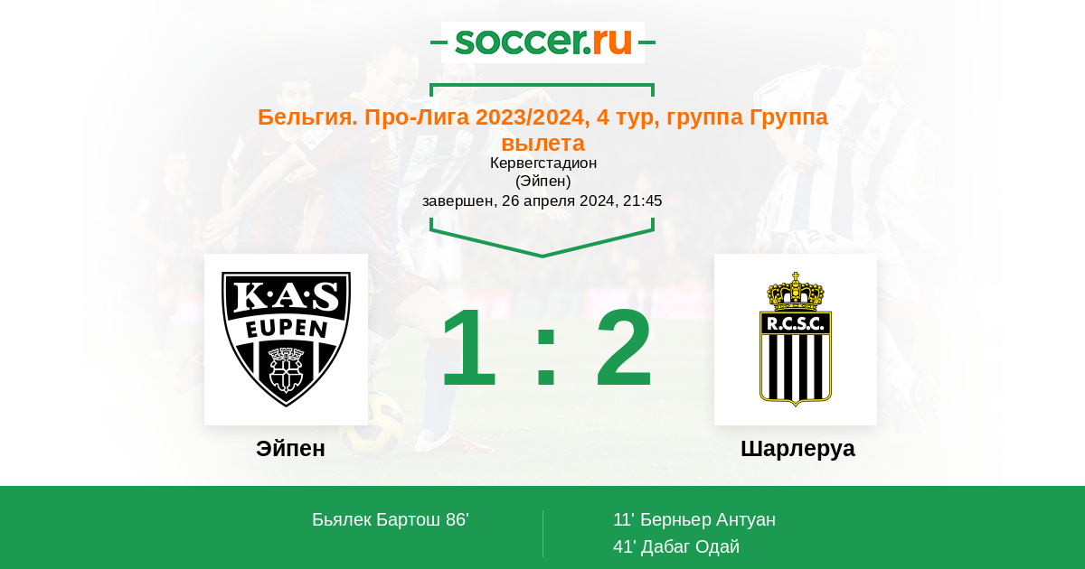 Бельгия. Про-Лига 21.04.2024 Шарлеруа Логотип футбольный клуб Шарлеруа 1:0 Логотип футбольный клуб Эйпен Эйпен