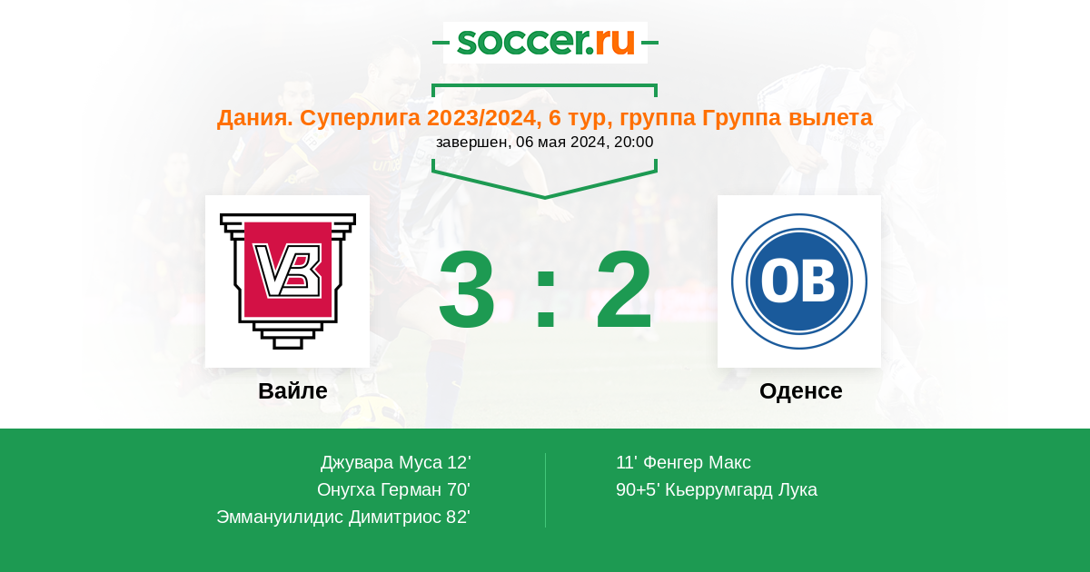 Дания. Суперлига 02.04.2024 Оденсе Логотип футбольный клуб Оденсе 0:1 Логотип футбольный клуб Вайле Вайле