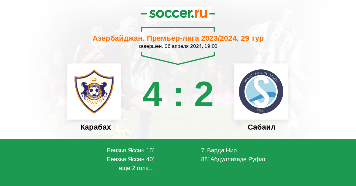 Азербайджан. Премьер-Лига 11.04.2025 Сабаил Логотип футбольный клуб Сабаил (Баку) 1:4 Логотип футбольный клуб Карабах (Агдам) Карабах