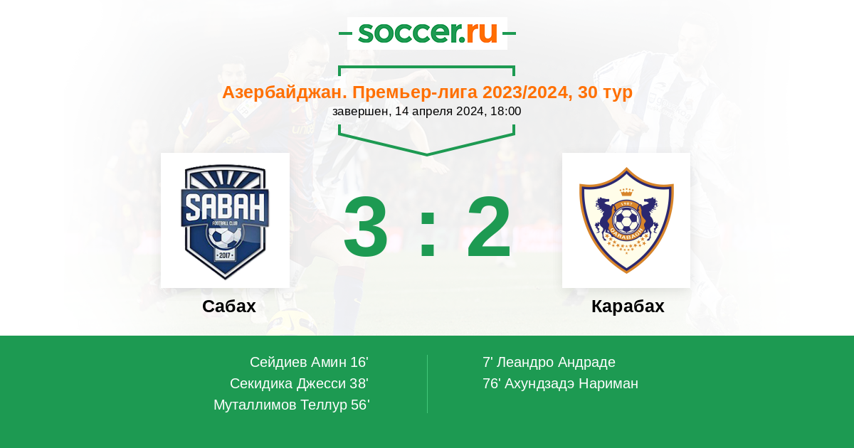 Азербайджан. Премьер-Лига 16.04.2023 Сабах Логотип футбольный клуб Сабах (Баку) 2:1 Логотип футбольный клуб Карабах (Агдам) Карабах