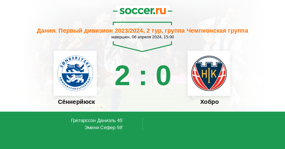 Дания. Суперлига 06.05.2018 Сённерйюск Логотип футбольный клуб Сённерйюск (Хадерслев) 1:0 Логотип футбольный клуб Хобро Хобро