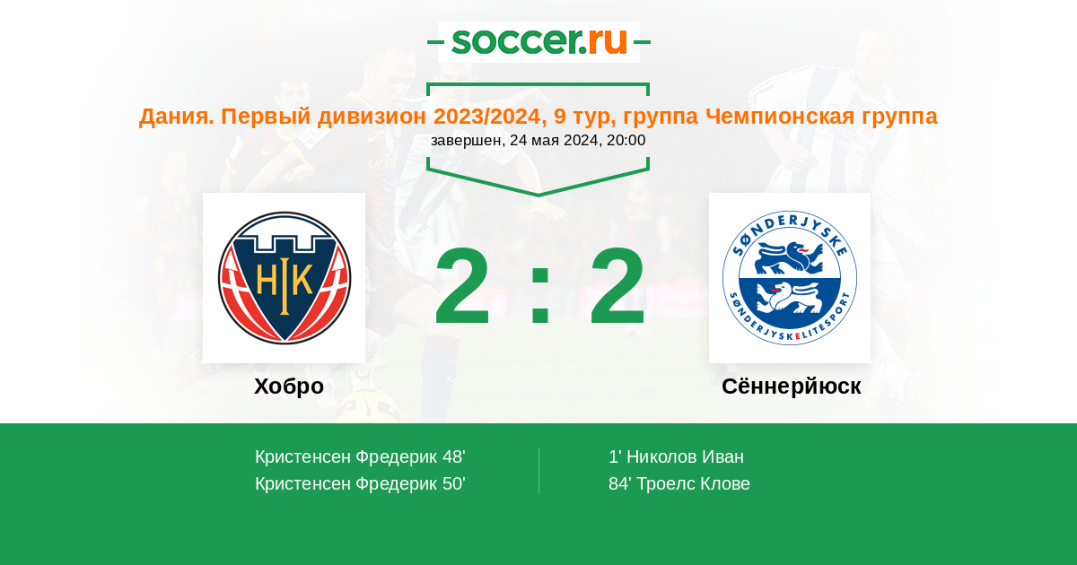 Дания. Первый дивизион 06.04.2024 Сённерйюск Логотип футбольный клуб Сённерйюск (Хадерслев) 2:0 Логотип футбольный клуб Хобро Хобро