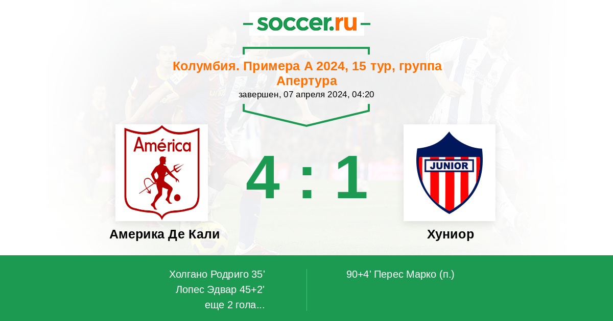 Колумбия. Примера А 31.01.2021 Хуниор Логотип футбольный клуб Хуниор (Барранкилья) 2:1 Логотип футбольный клуб Америка Де Кали Америка Де Кали