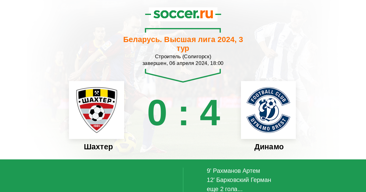 Беларусь. Высшая лига 20.06.2006 Динамо Логотип футбольный клуб Динамо (Брест) 3:1 Логотип футбольный клуб Шахтер (Солигорск) Шахтер