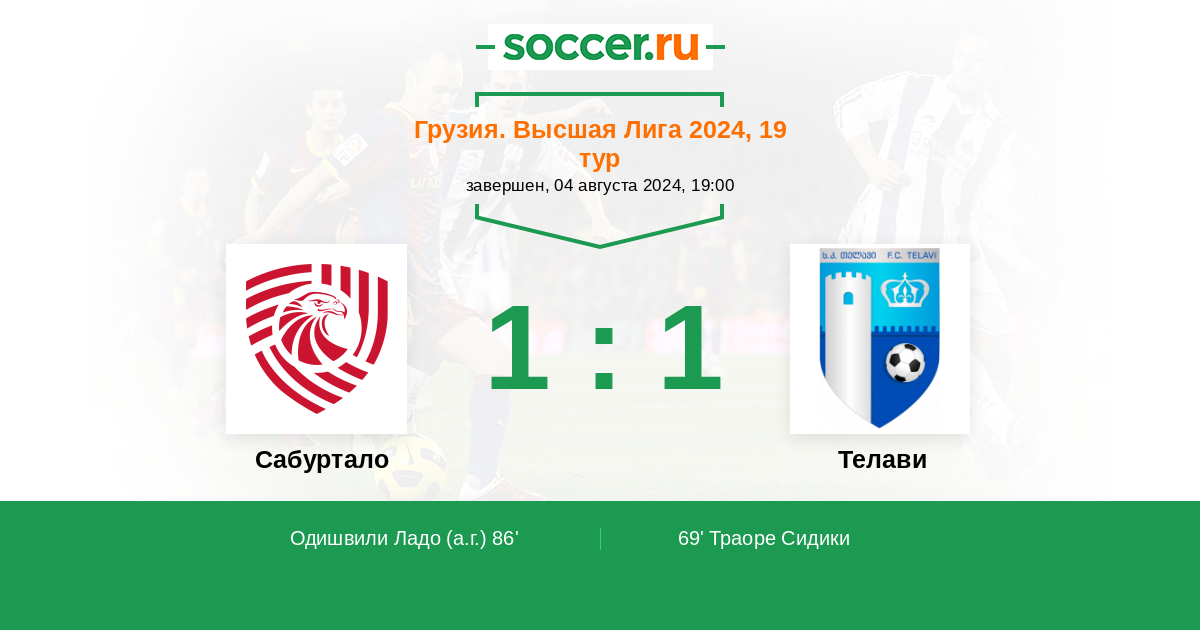 Грузия. Высшая лига 16.09.2021 Сабуртало Логотип футбольный клуб Сабуртало (Тбилиси) 2:1 Логотип футбольный клуб Телави Телави