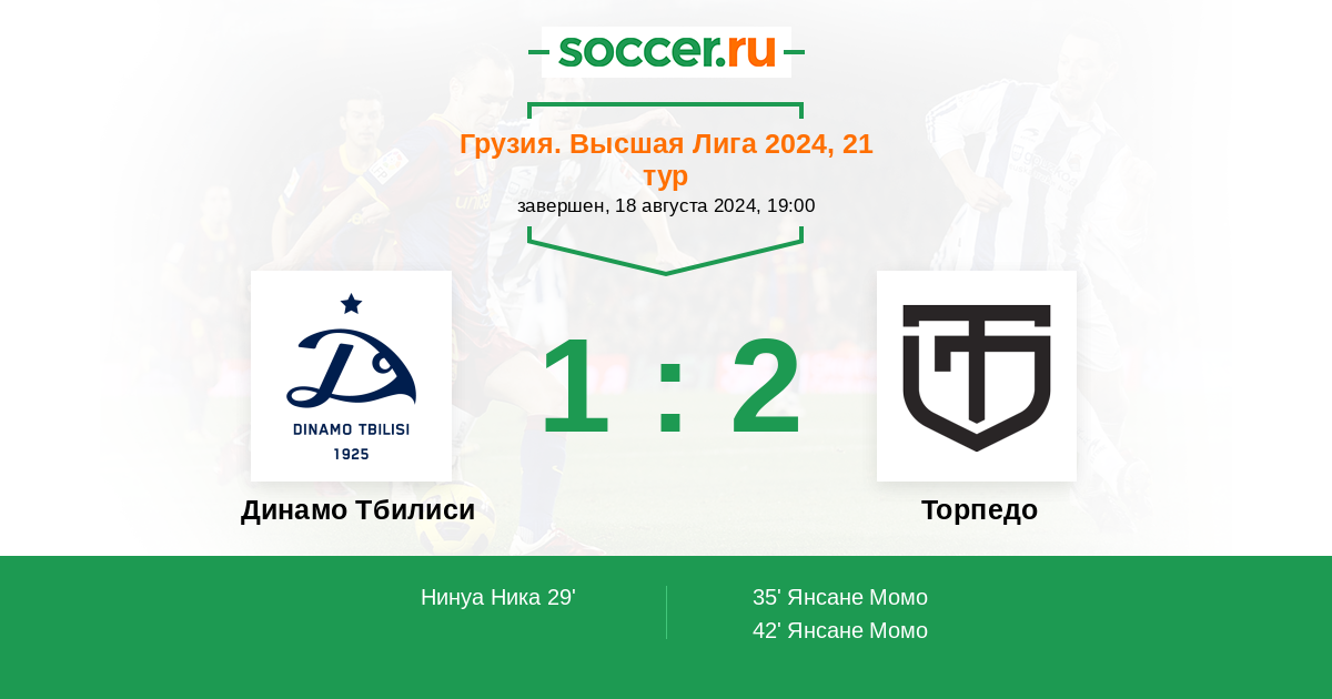 Грузия. Высшая лига 20.08.2019 Торпедо Логотип футбольный клуб Торпедо (Кутаиси) 0:1 Логотип футбольный клуб Динамо Тбилиси Динамо Тбилиси