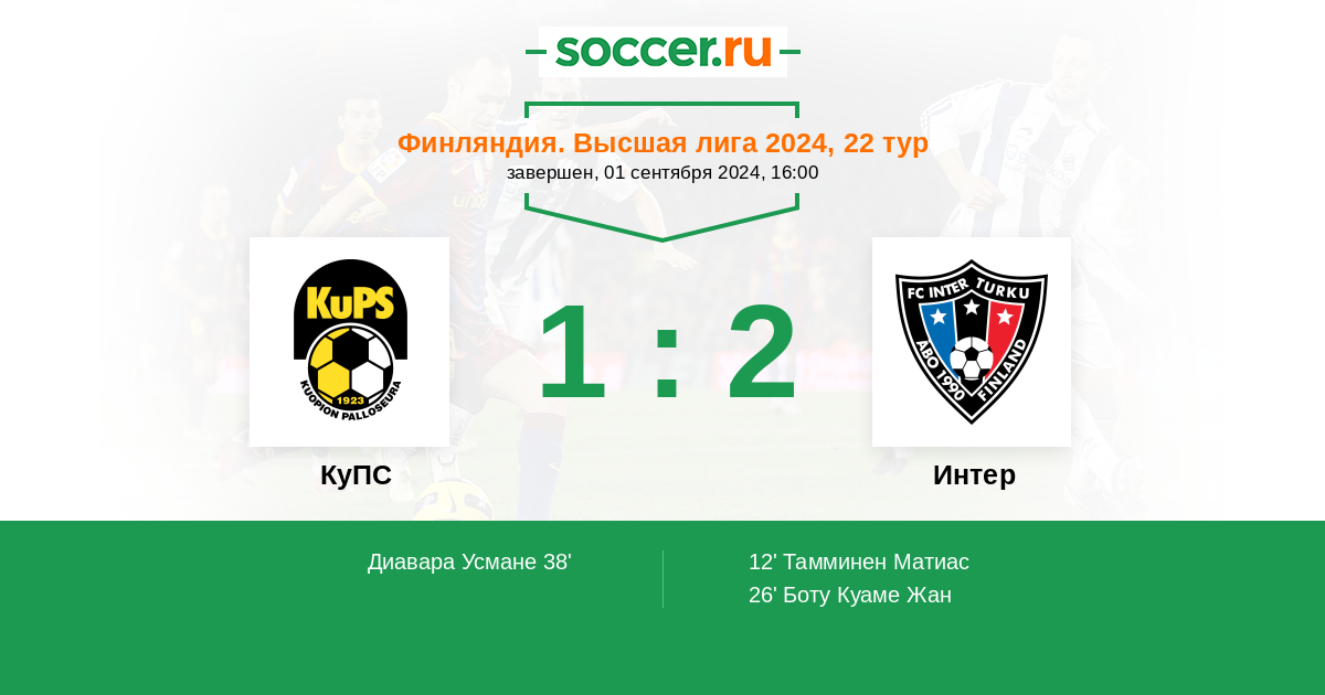 Финляндия. Высшая лига 22.07.2012 КуПС Логотип футбольный клуб КуПС (Купио) 0:6 Логотип футбольный клуб Интер (Турку) Интер