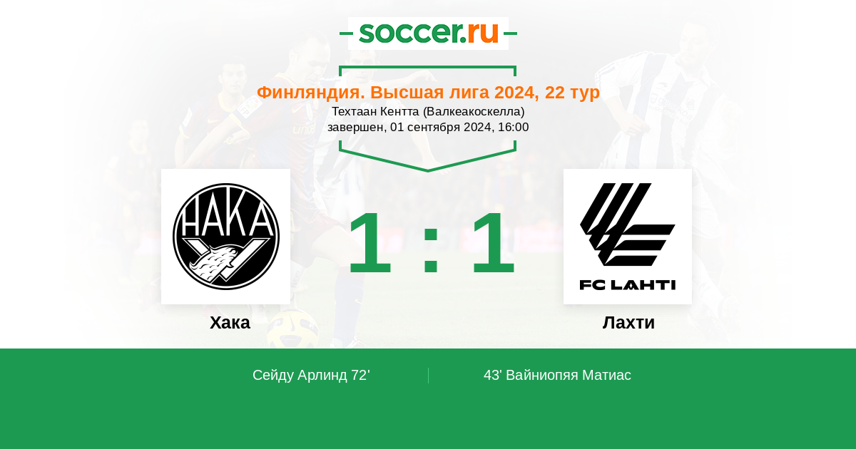 Финляндия. Высшая лига 15.06.2021 Хака Логотип футбольный клуб Хака (Валкеакоски) 1:1 Логотип футбольный клуб Лахти Лахти