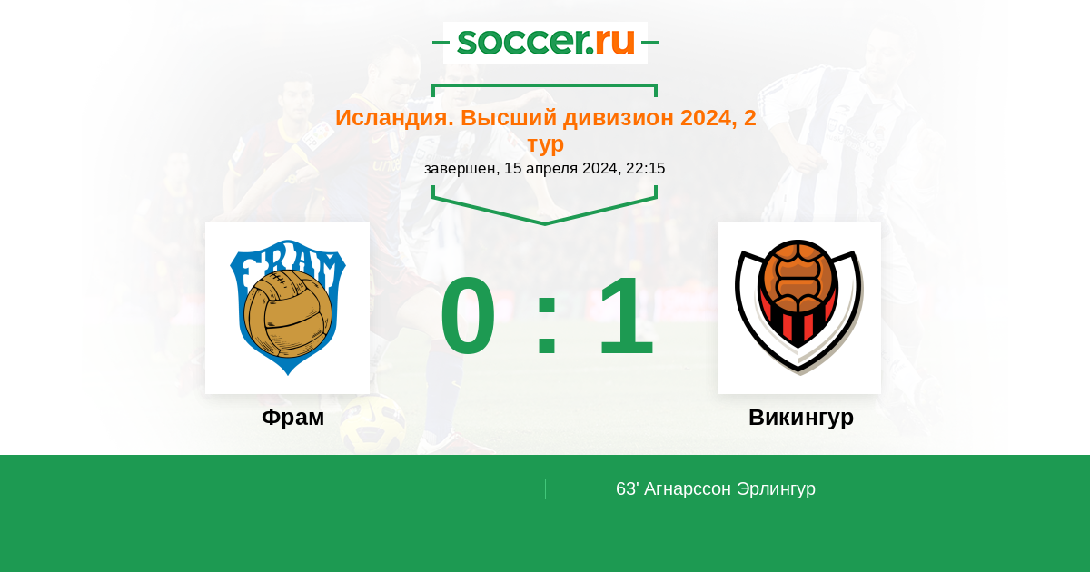 Исландия. Высший дивизион 30.06.2024 Викингур Логотип футбольный клуб Викингур (Рейкьявик) 2:1 Логотип футбольный клуб Фрам (Рейкьявик) Фрам