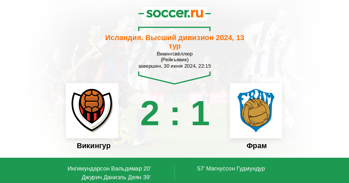 Исландия. Высший дивизион 11.06.2023 Викингур Логотип футбольный клуб Викингур (Рейкьявик) 3:1 Логотип футбольный клуб Фрам (Рейкьявик) Фрам