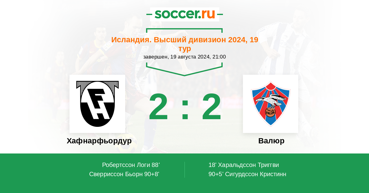 Исландия. Высший дивизион 25.05.2024 Валюр Логотип футбольный клуб Валюр (Рейкьявик) 2:2 Логотип футбольный клуб Хафнарфьордур Хафнарфьордур