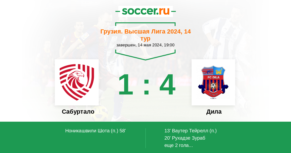 Грузия. Высшая лига 02.05.2025 Сабуртало Логотип футбольный клуб Сабуртало (Тбилиси) 1:0 Логотип футбольный клуб Дила (Гори) Дила