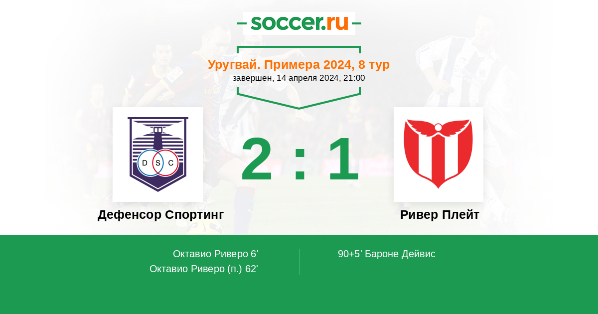 Уругвай. Примера A 14.10.2017 Дефенсор Спортинг Логотип футбольный клуб Дефенсор Спортинг (Монтевидео) 2:1 Логотип футбольный клуб Ривер Плейт (Монтевидео) Ривер Плейт