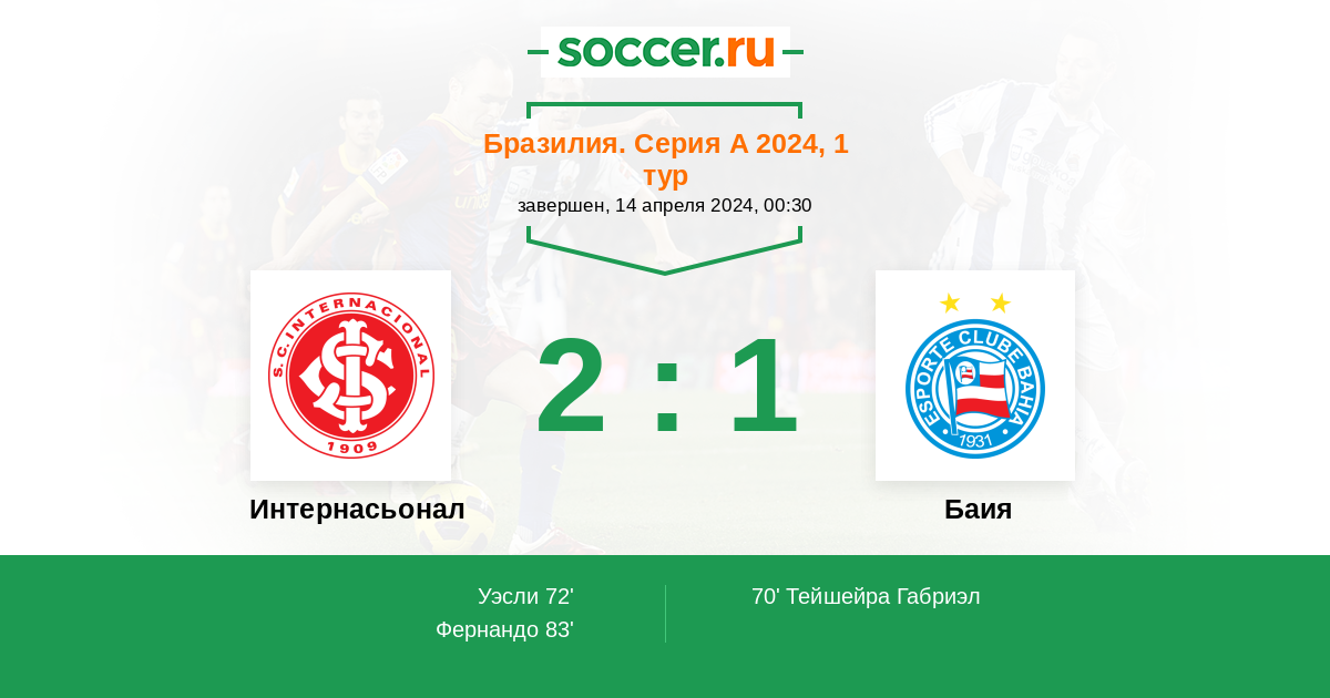 Бразилия. Серия А 15.04.2018 Интернасьонал Логотип футбольный клуб Интернасьонал (Порту-Алегри) 2:0 Логотип футбольный клуб Баия (Салвадор) Баия