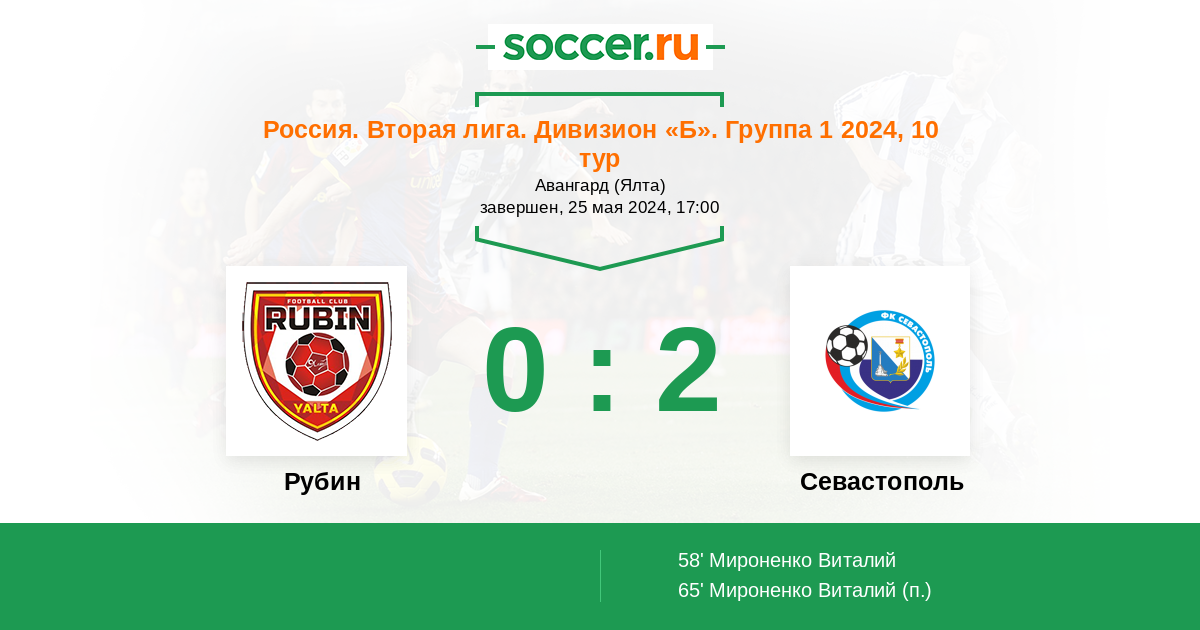 Россия. Вторая лига. Дивизион «Б». Группа 1 17.05.2025 Рубин Логотип футбольный клуб Рубин (Ялта) 2:1 Логотип футбольный клуб Севастополь Севастополь