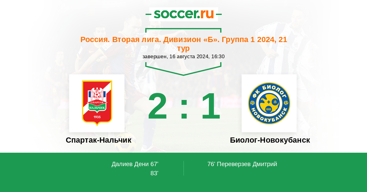 Россия. Вторая лига. Группа 1 07.08.2022 Биолог-Новокубанск Логотип футбольный клуб Биолог-Новокубанск 3:2 Логотип футбольный клуб Спартак-Нальчик Спартак-Нальчик