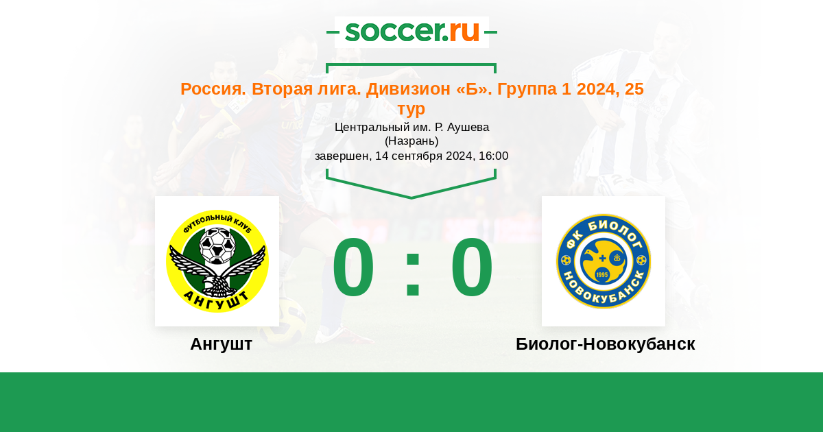 Россия. Вторая лига. Группа 1 04.08.2017 Биолог-Новокубанск Логотип футбольный клуб Биолог-Новокубанск 2:1 Логотип футбольный клуб Ангушт (Назрань) Ангушт