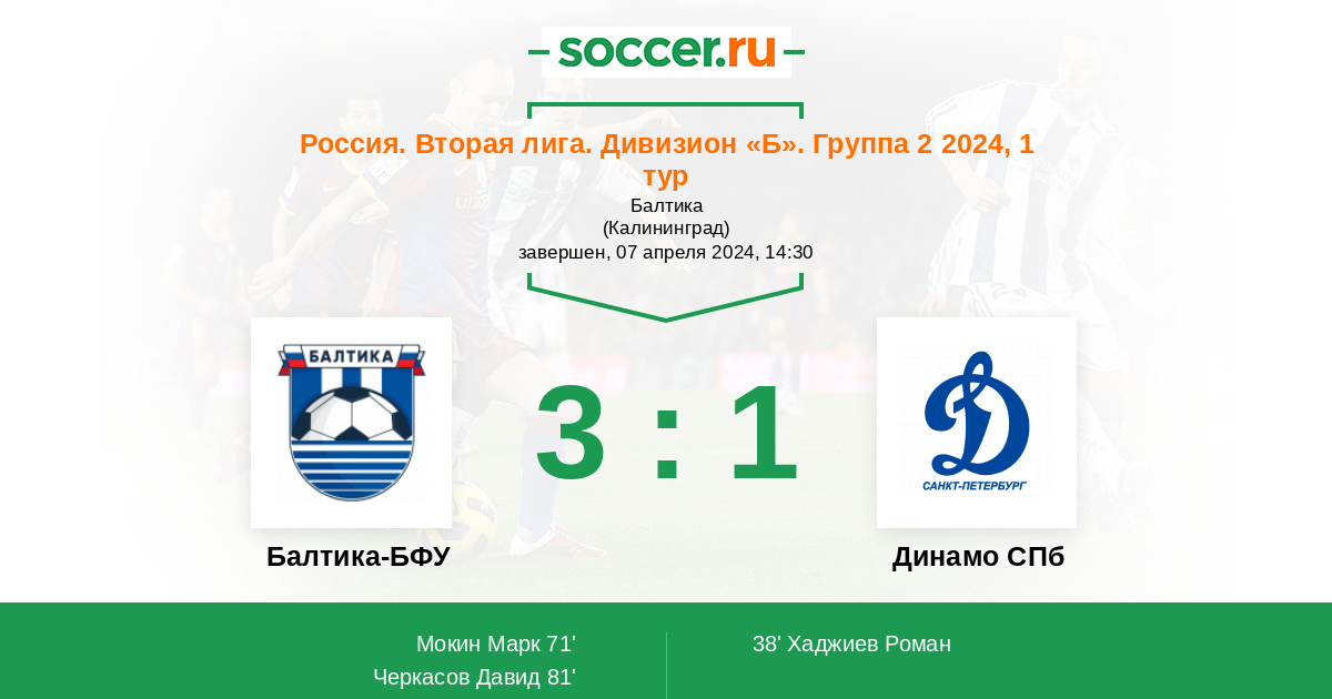 Россия. Вторая лига. Группа 2 28.08.2022 Динамо СПб Логотип футбольный клуб Динамо СПб (Санкт-Петербург) 1:3 Логотип футбольный клуб Балтика-БФУ (Калининград) Балтика-БФУ