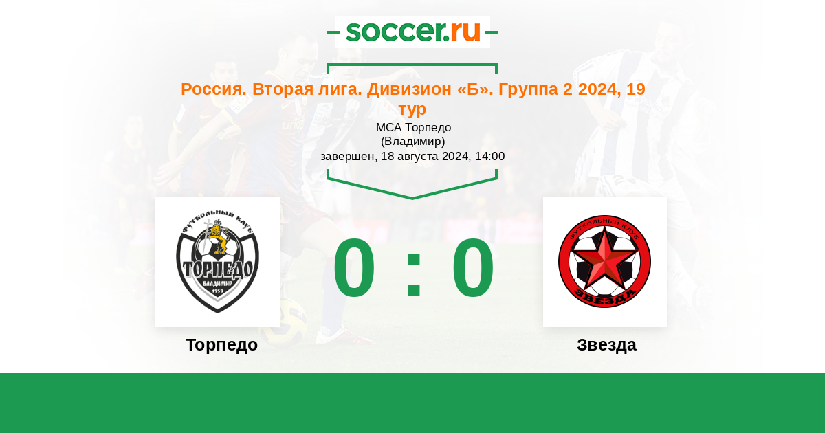 Россия. Вторая лига. Группа 2 23.08.2020 Звезда Логотип футбольный клуб Звезда (Санкт-Петербург) 1:0 Логотип футбольный клуб Торпедо (Владимир) Торпедо