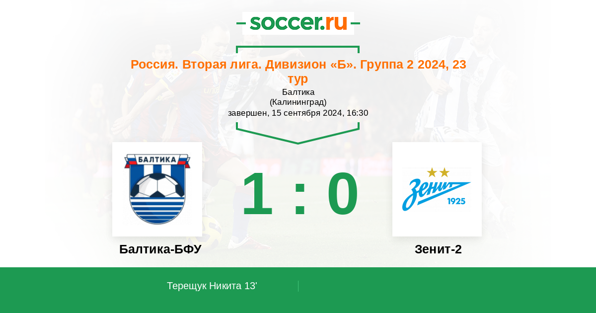 Россия. Вторая лига. Дивизион «Б». Группа 2 28.08.2023 Зенит-2 Логотип футбольный клуб Зенит-2 (Санкт-Петербург) 2:1 Логотип футбольный клуб Балтика-БФУ (Калининград) Балтика-БФУ