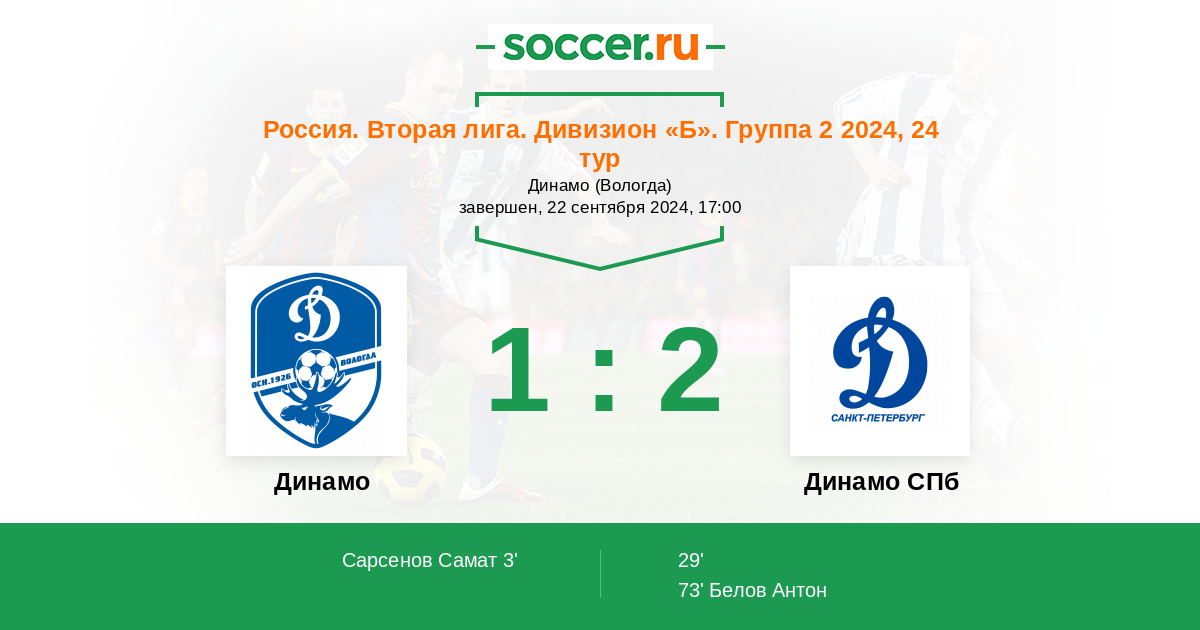 Россия. Вторая лига. Дивизион «Б». Группа 2 22.10.2023 Динамо Вологда Логотип футбольный клуб Динамо Вологда 0:2 Логотип футбольный клуб Динамо СПб (Санкт-Петербург) Динамо СПб