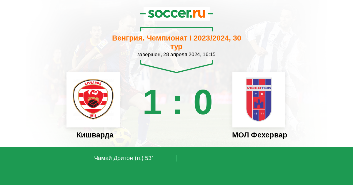 Венгрия. Чемпионат 1 06.06.2020 МОЛ Фехервар Логотип футбольный клуб МОЛ Фехервар (Секешфехервар) 2:0 Логотип футбольный клуб Кишварда Кишварда