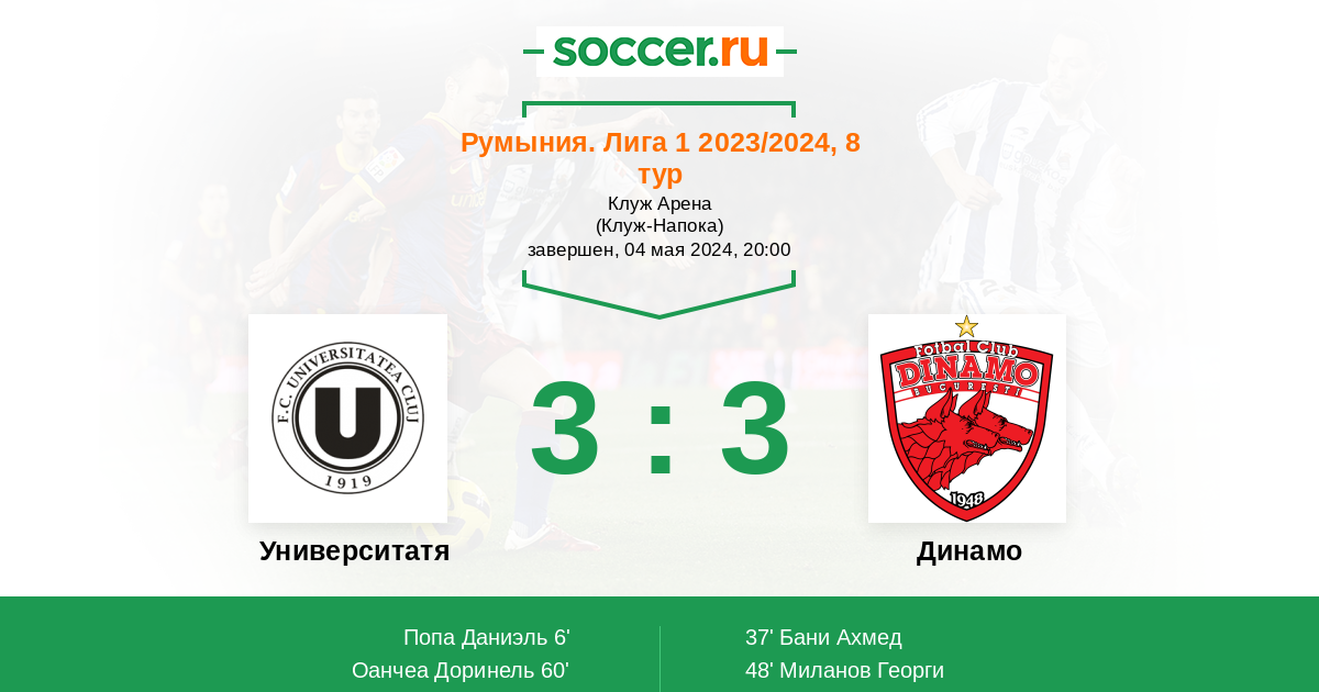 Румыния. Лига 1 05.08.2023 Университатя Клуж Логотип футбольный клуб Университатя Клуж 1:1 Логотип футбольный клуб Динамо (Бухарест) Динамо